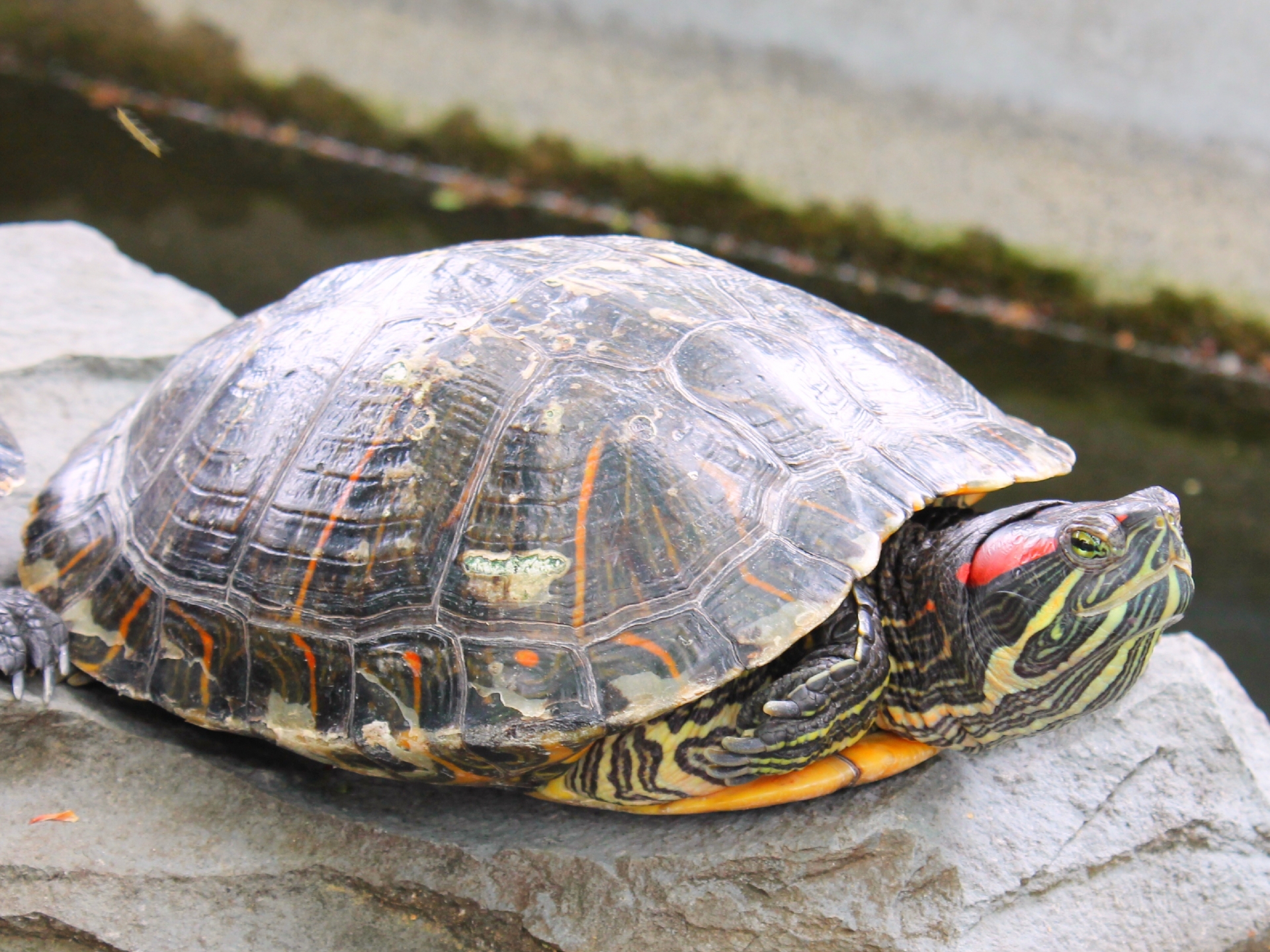 頭部の両脇にある赤い斑が特徴的な淡水生のカメです。「ミドリガメ」の通称でペットとして輸入され、捨てられたり逃げ出したりした個体が野生化しました。現在では日本全国に分布しています。