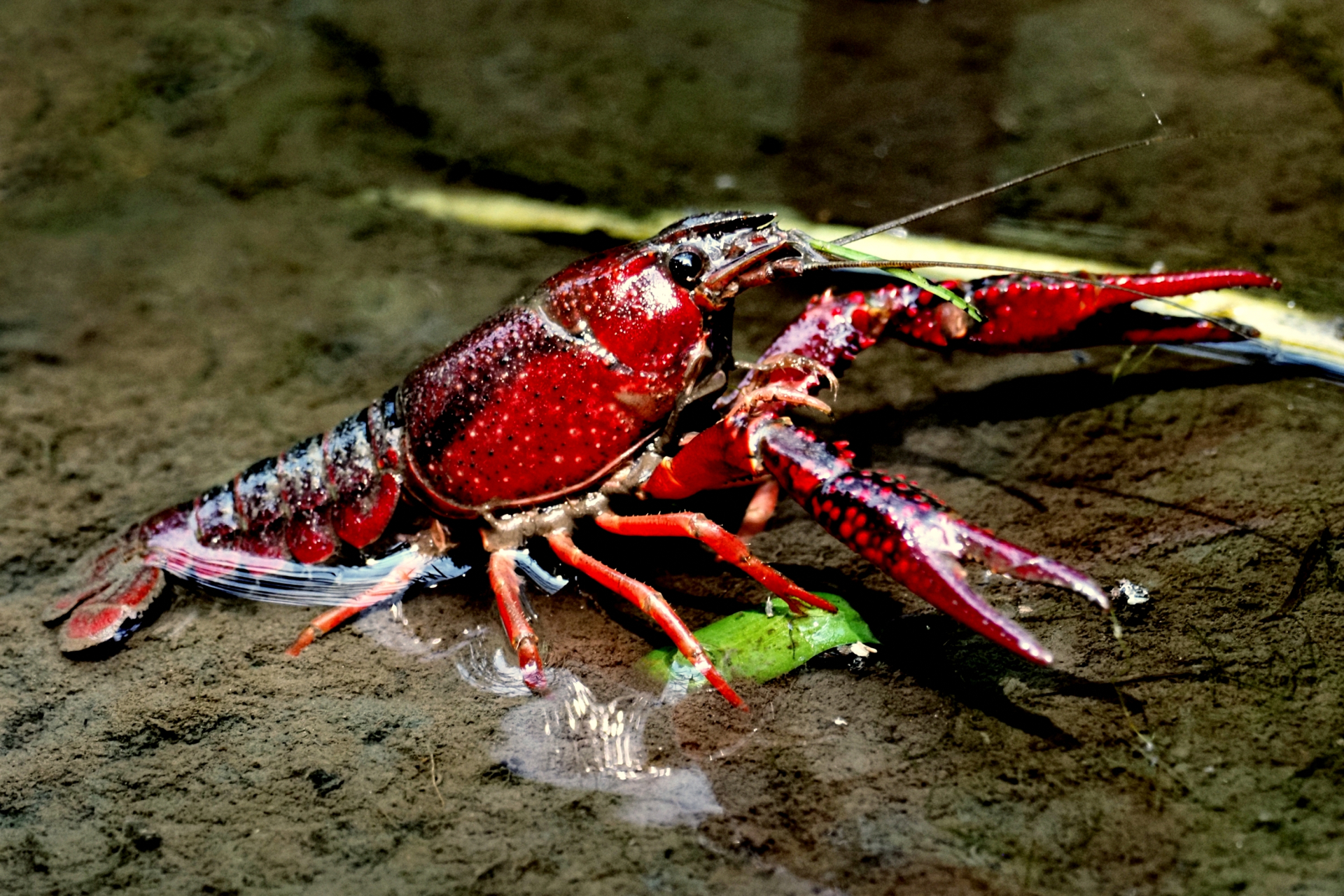 池や水田、水路、河川の流れが緩やかな場所などに生息するザリガニです。成体は主に暗赤色ですが、さまざまな色彩の変異があります。